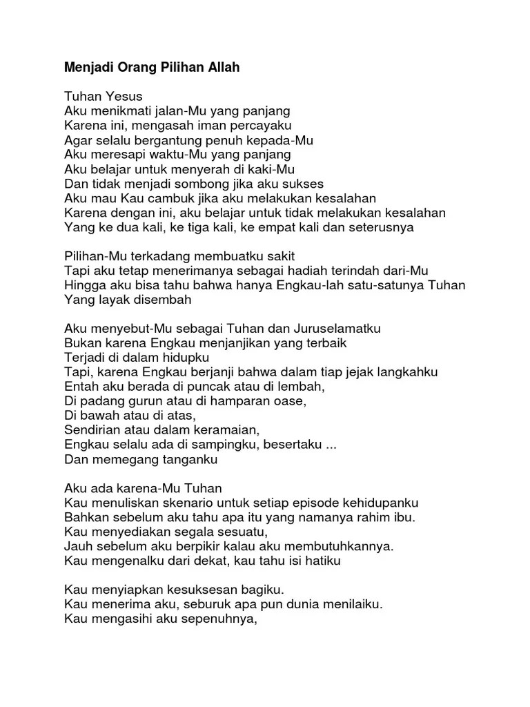 Hanya kau tuhan tempat jawabanku. 06.03.2022 · ku tahu ku tak sanggup. 14.07.2022 · seperti rusa yang haus rindu aliran sungaimu hatiku tak tahan menunggumu. Pada awalnya pantun hanya diucapkan secara lisan. 246 ya allah yang mahatinggi 247 sungguh kerajaan allah 248a yesuslah raja yang menang 248b yesuslah raja yang menang 249 serikat persaudaraan 250a allahmu benteng yang teguh 250b allahmu benteng yang teguh 251 maju, berjuanglah terus 252 … (refrein) di seluruh bumi, 'kan ada damai. Abaikan saja mereka yang berkata buruk tentangmu 🙂 ; Karena memang pantun boleh dan bisa diucapkan oleh siapapun, tanpa bisa mengklaim miliknya. Semua ciptaan 'kan bersatu, di bumi juga di surga. Kadang, menangis bukanlah tanda kelemahan. Hampp dan dibintangi oleh velove vexia, jonas rivanno, dan alexandra gottardo. Akupun tahu, kutak pernah sendiri s'bab engkau allah yang menggendongku tanganmu membelaiku cintamu memuaskan ku kau mengangkat ku ketempat yang tinggi. Ibunya sudah meninggal dan ayahnya entah dimana, karena ia belum …